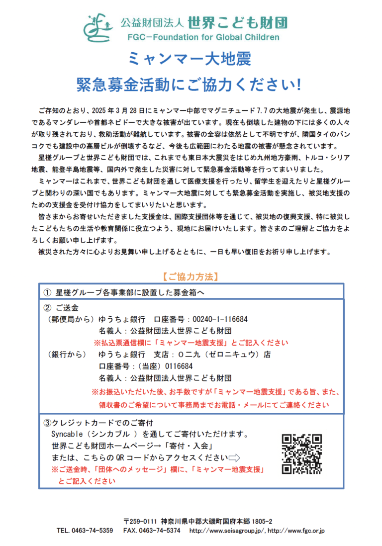 ミャンマーはこれまで、世界こども財団を通して医療支援を行ったり、留学生を迎えたりと星槎グループと関わりの深い国でもあります。ミャンマー大地震に対しても緊急募金活動を実施し、被災地支援のための支援金を受付け協力をしてまいりたいと思います。